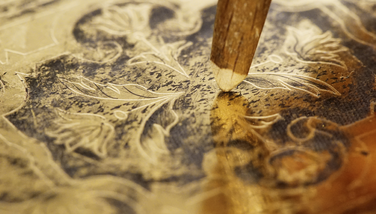Églomisé is a traditional technique of decorative glass painting dating back to Egyptian times. It is a very delicate, elaborate and imperfect craft, which gives each piece its own distinct character.